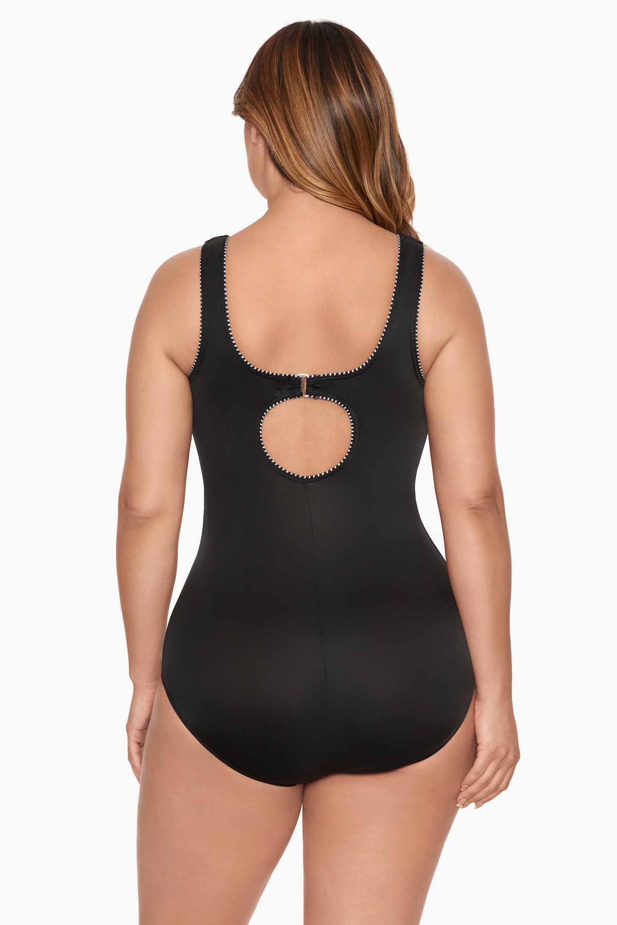 A modern classic, now made for the beach — and curvacious bodies. This black and white color-blocked look creates a flattering silhouette, making it one of the best plus-size swimwear options around. Embrace your curves in a shapewear bathing suit as chic as you.